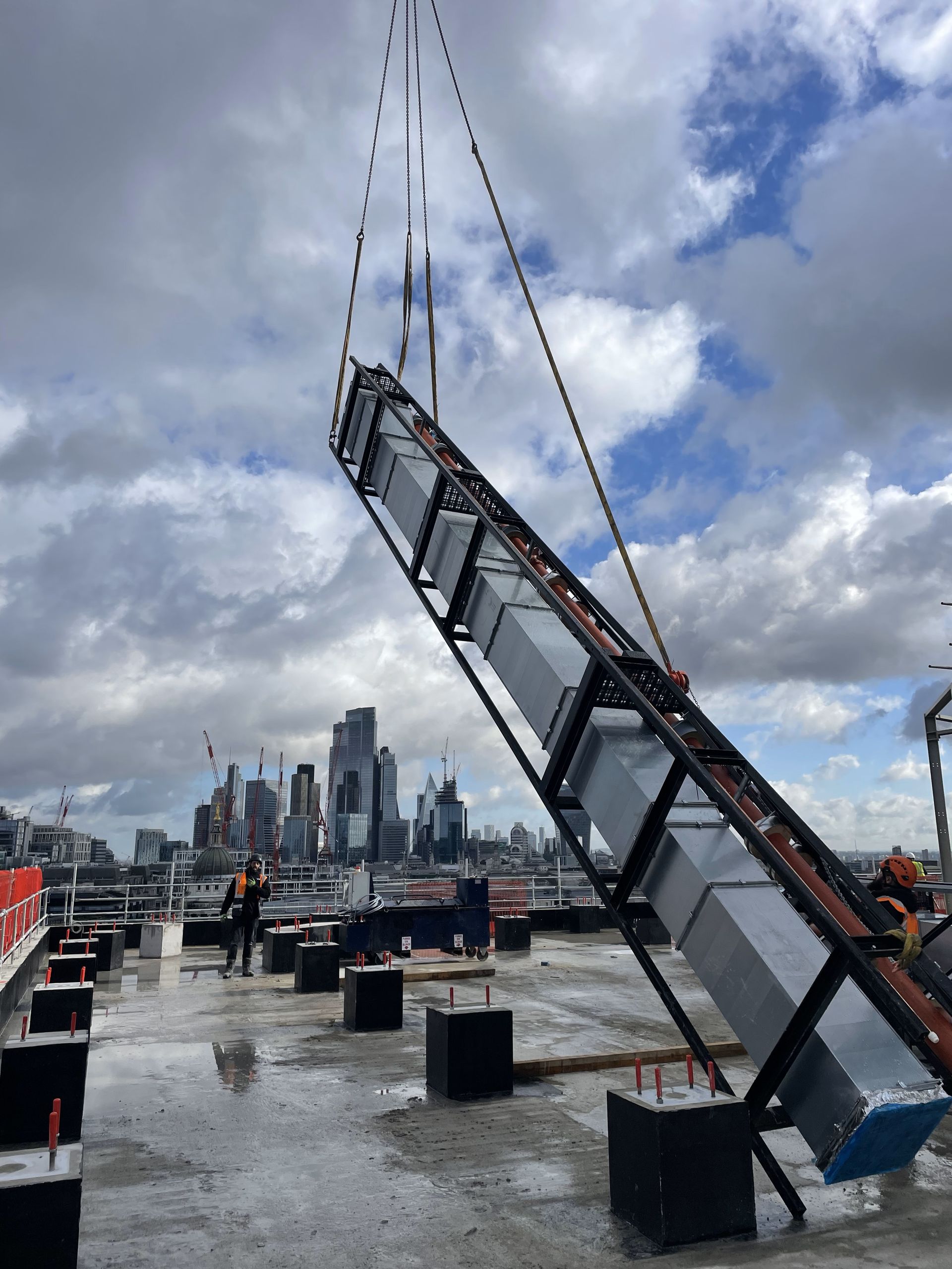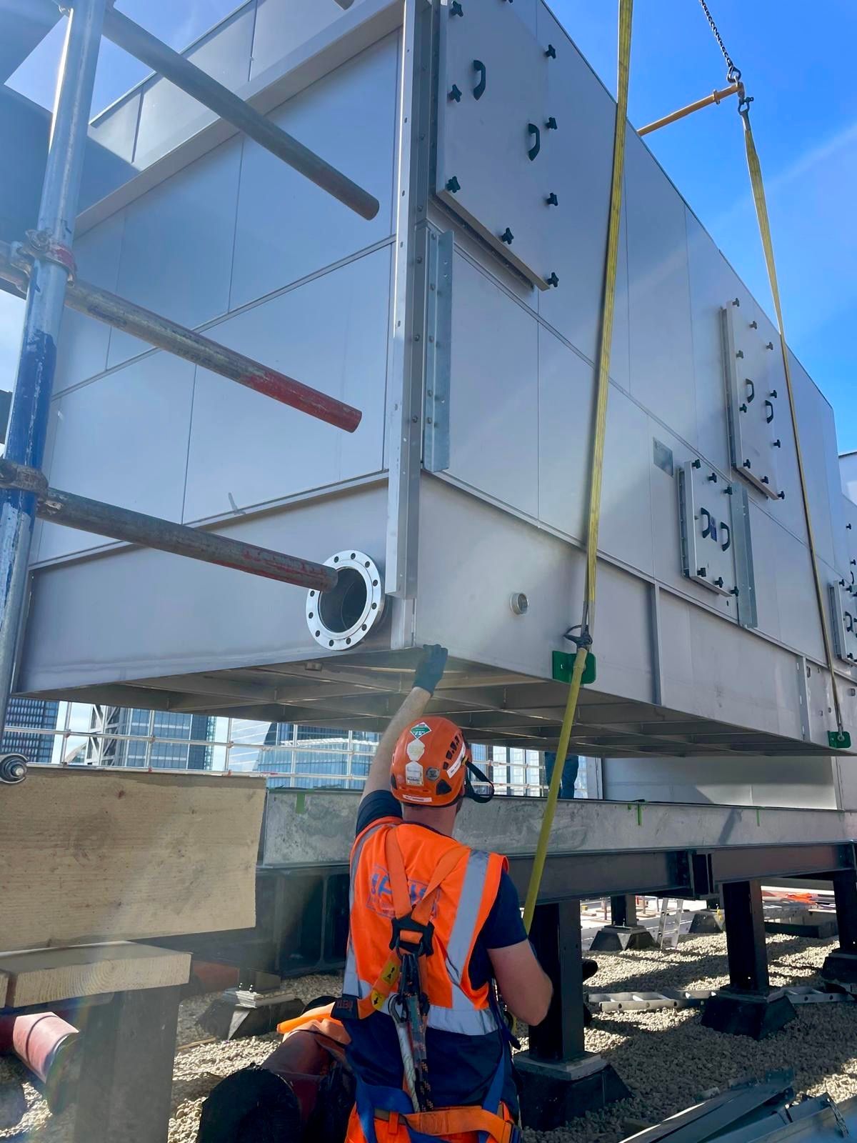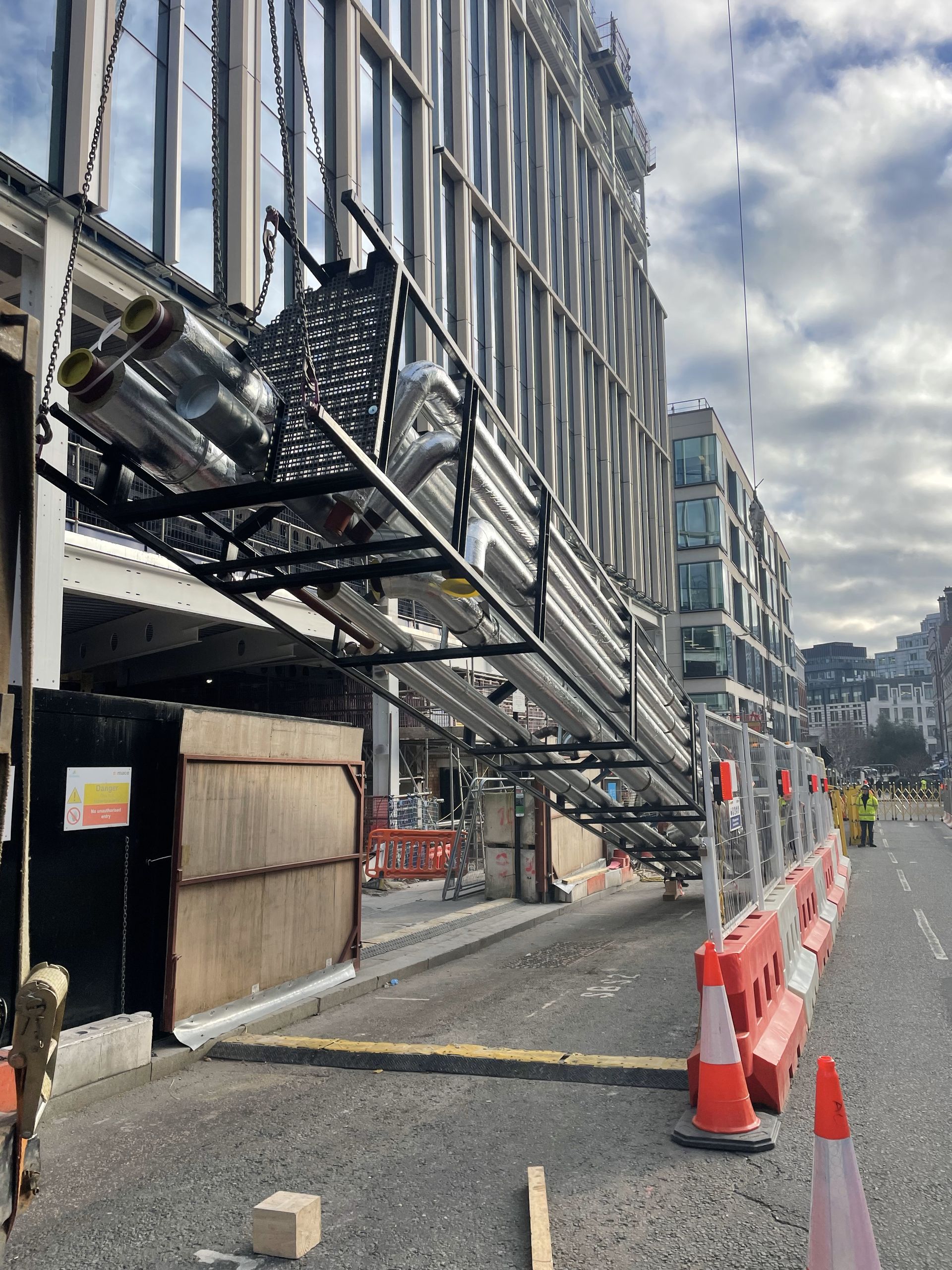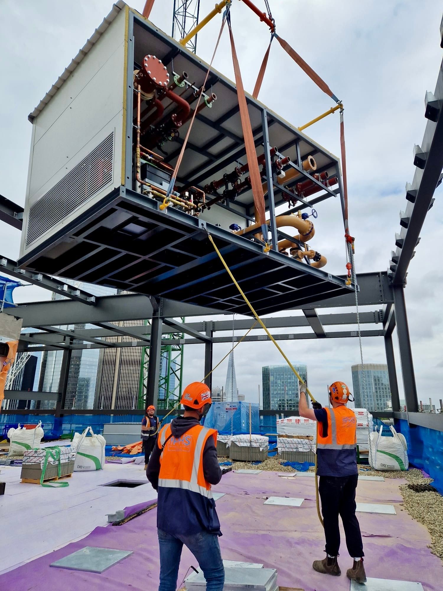 PHS worked on a new build next to London’s Liverpool Street Station, offloading and installing the Heat Interface Units on each of the 12 floors, the roof plant including the Cooling Towers weighing over 30,000kgs when fully constructed, Air Source Heat Pumps, Chillers and the four section Package Plantroom with the heaviest section at 11,000kgs, these were landed on the roof and pulled together by the team, all lifts were carefully planned, managed and completed by our experienced plant handling lifting team.