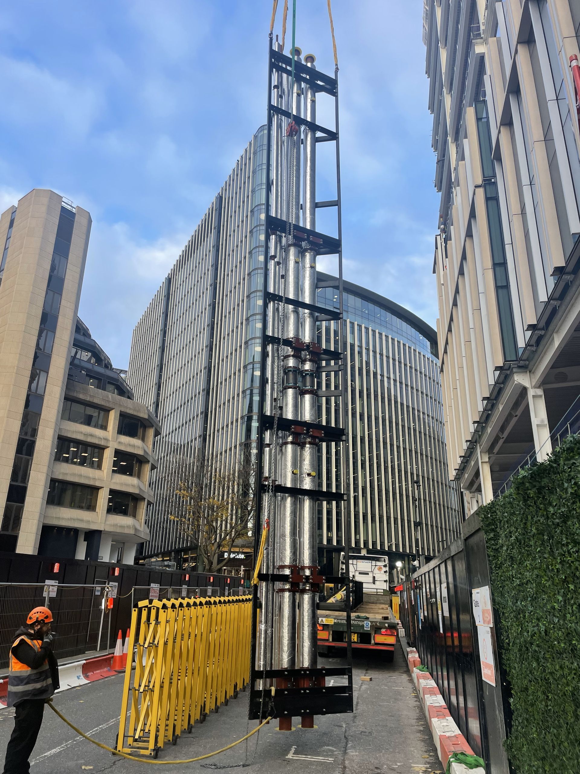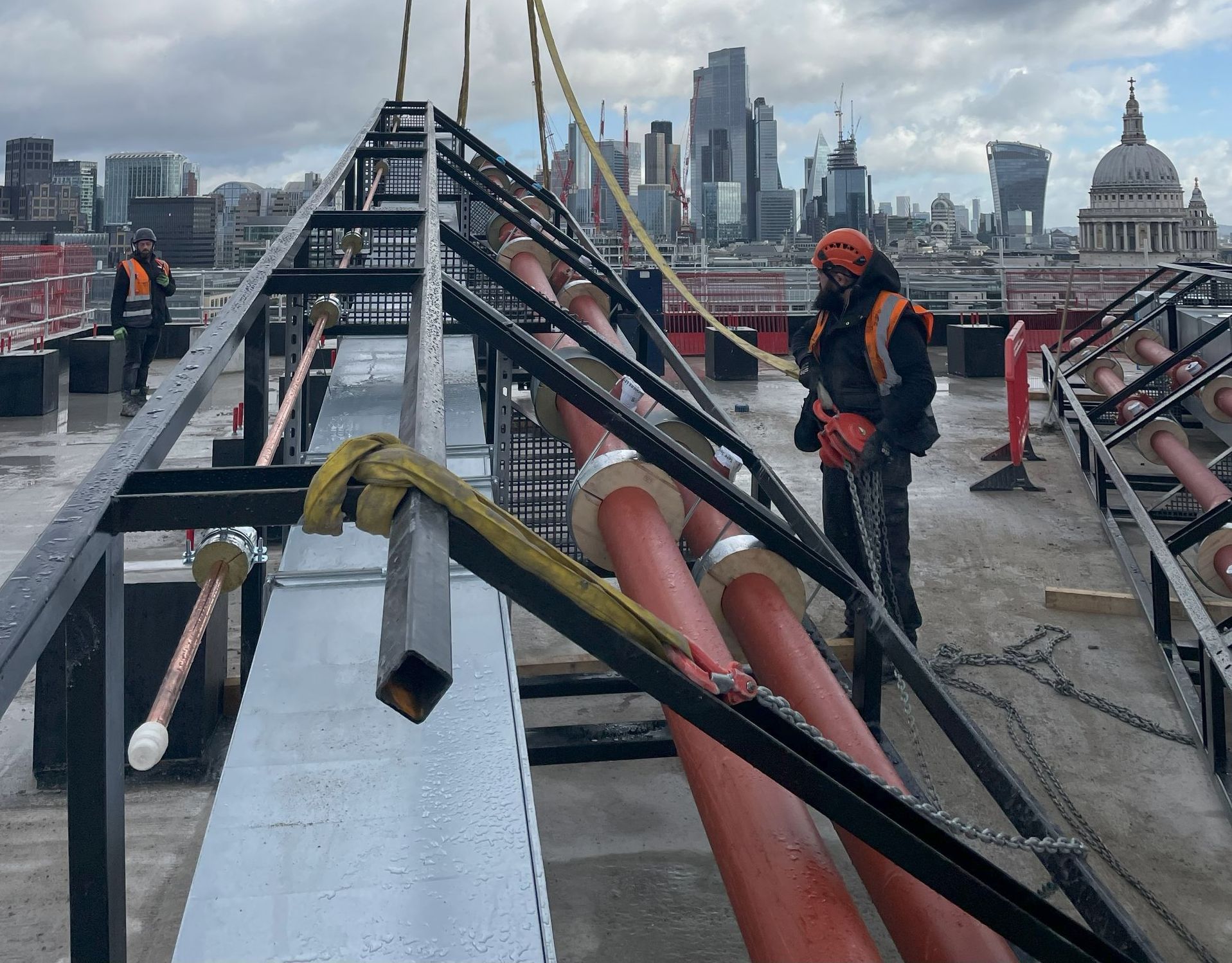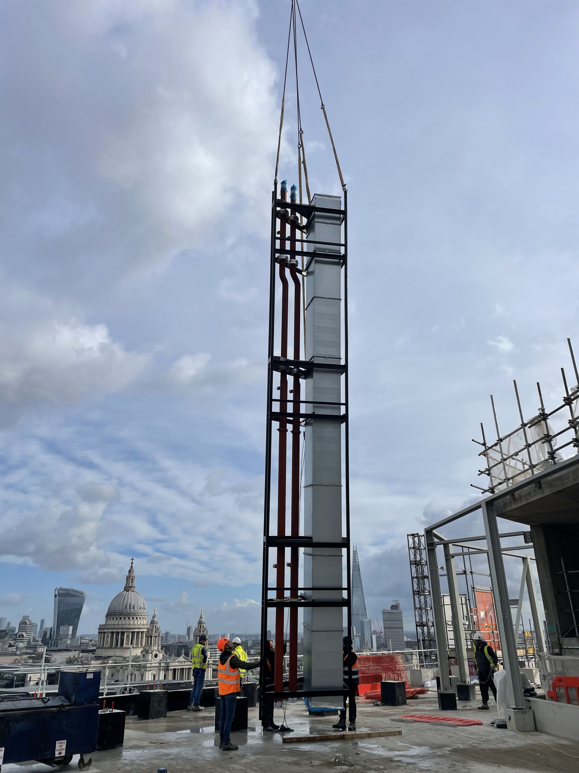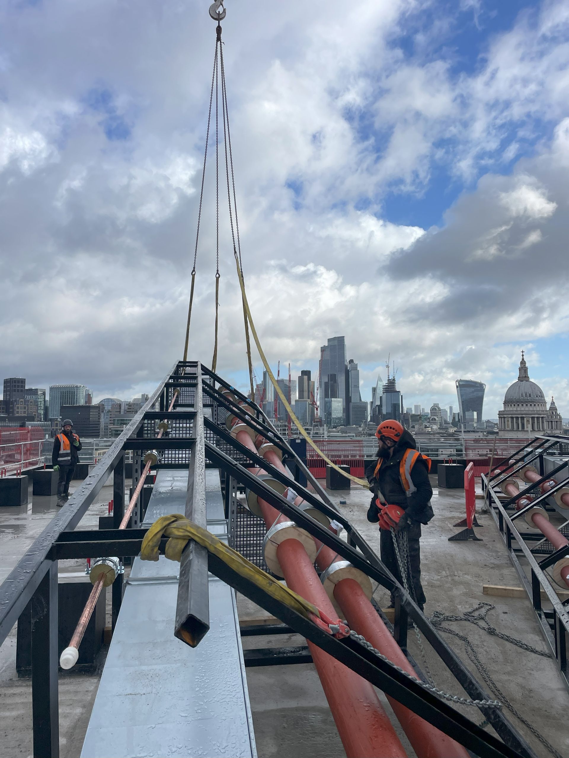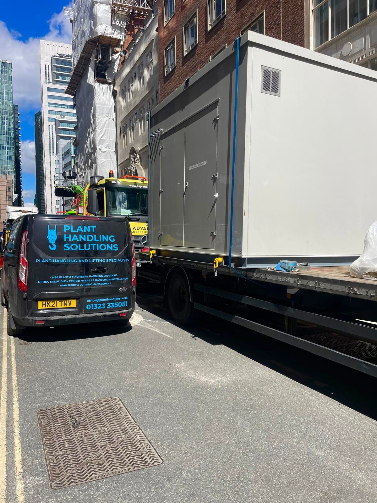 PHS worked on a new build next to London’s Liverpool Street Station, offloading and installing the Heat Interface Units on each of the 12 floors, the roof plant including the Cooling Towers weighing over 30,000kgs when fully constructed, Air Source Heat Pumps, Chillers and the four section Package Plantroom with the heaviest section at 11,000kgs, these were landed on the roof and pulled together by the team, all lifts were carefully planned, managed and completed by our experienced plant handling lifting team.