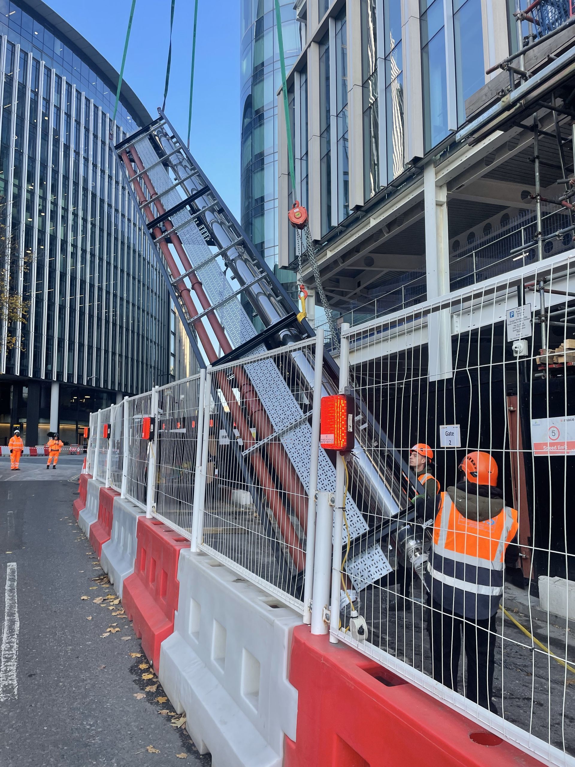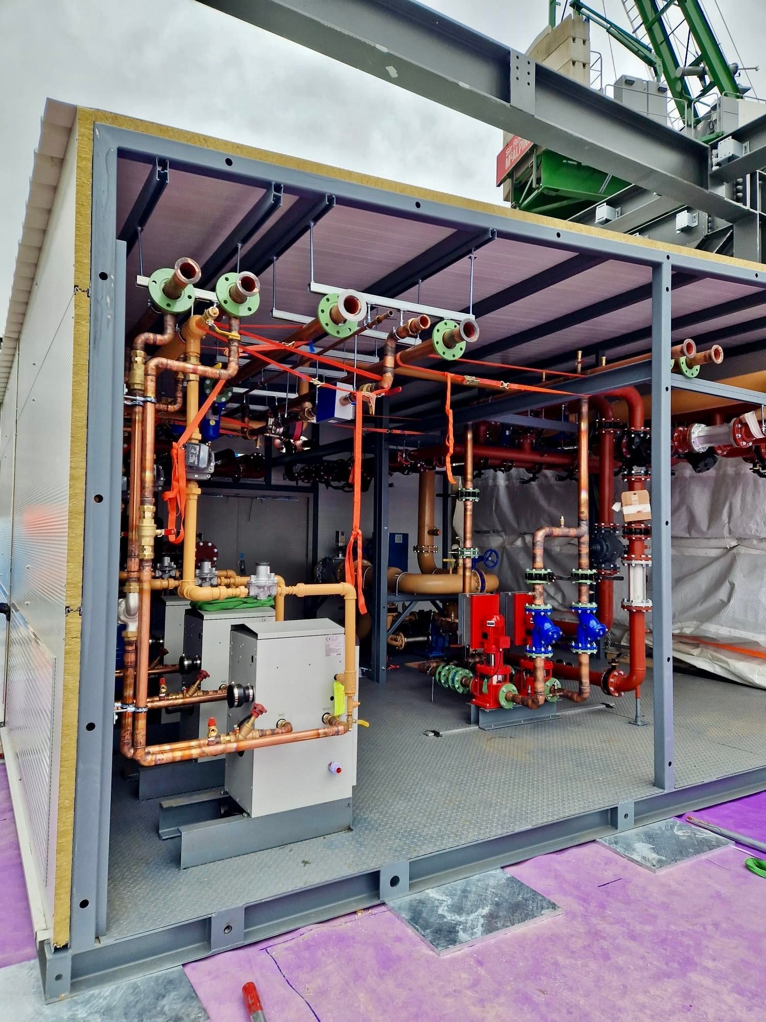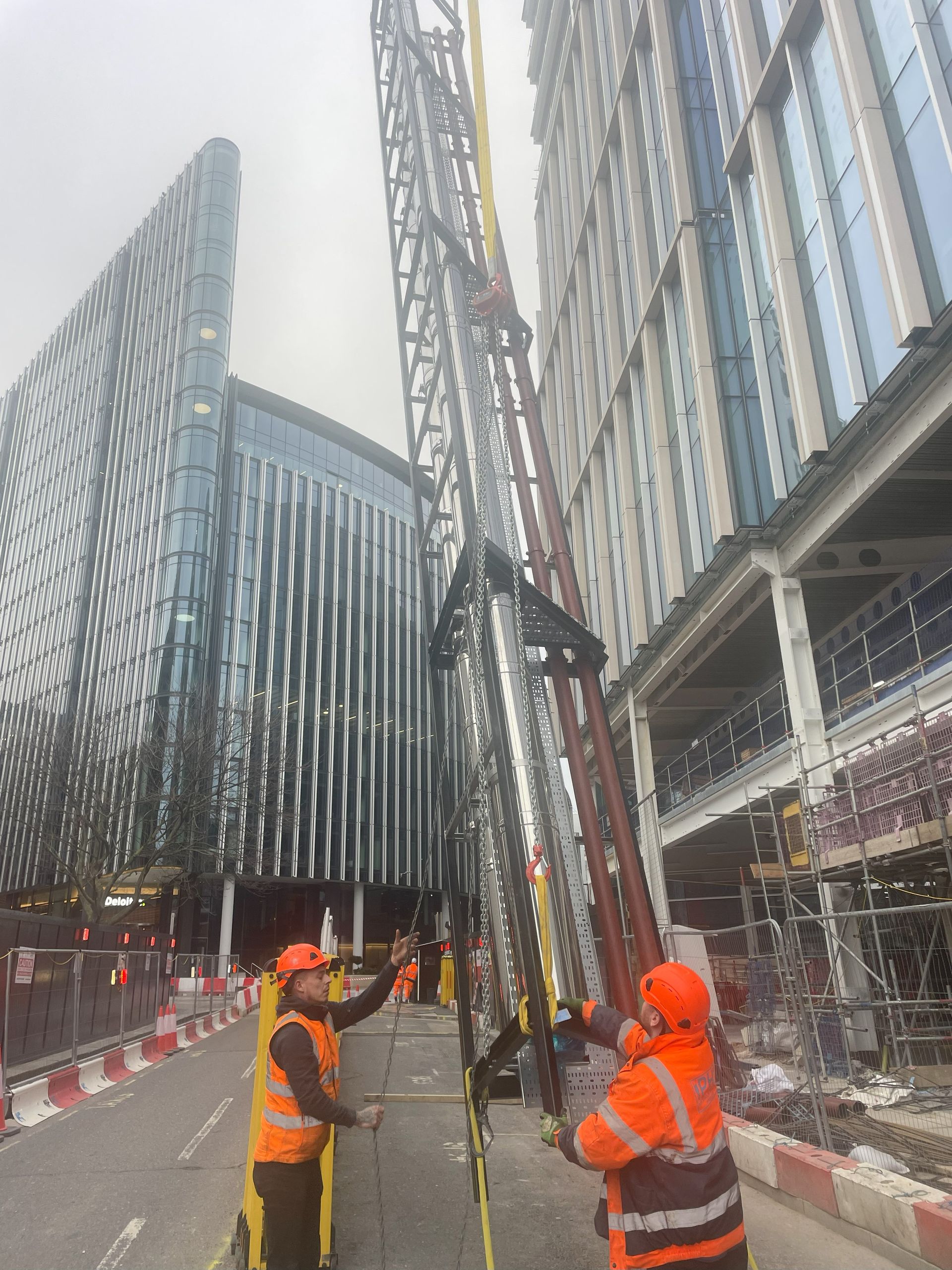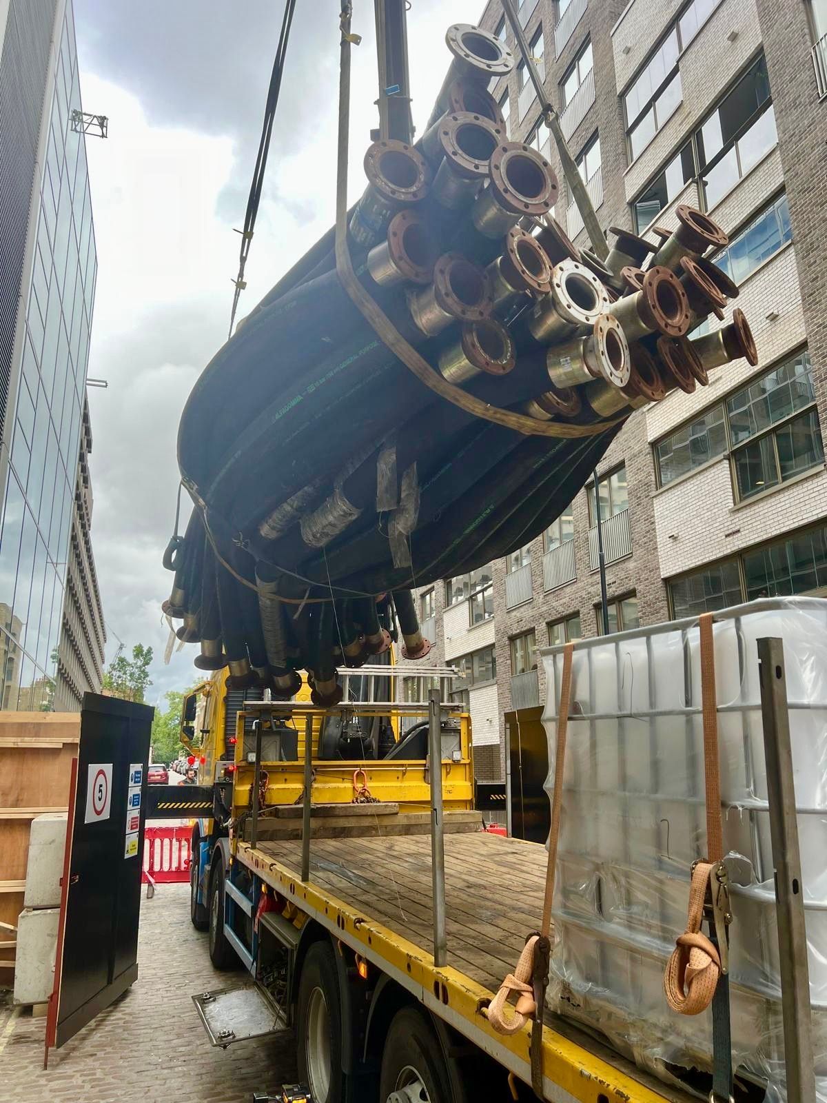 PHS worked on a new build next to London’s Liverpool Street Station, offloading and installing the Heat Interface Units on each of the 12 floors, the roof plant including the Cooling Towers weighing over 30,000kgs when fully constructed, Air Source Heat Pumps, Chillers and the four section Package Plantroom with the heaviest section at 11,000kgs, these were landed on the roof and pulled together by the team, all lifts were carefully planned, managed and completed by our experienced plant handling lifting team.